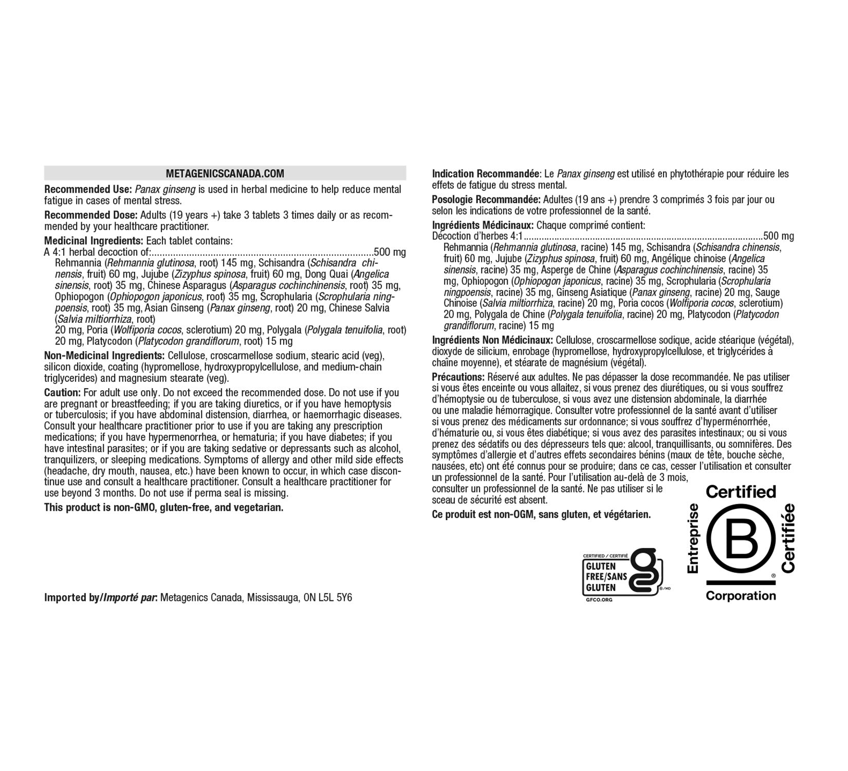 Ingrédients non médicinaux : Cellulose, croscarmellose sodique, acide stéarique (végétal), dioxyde de silicium, stéarate de magnésium (végétal), et enrobage (hypromellose, hydroxypropylcellulose, et triglycérides à chaîne moyenne).